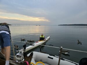 Schließlich zieht der Mann mit seinen Gänsen weiter und versucht sein Glück bei einem weiteren Ankerlieger. Dort hat er offensichtlich keinen Erfolg.