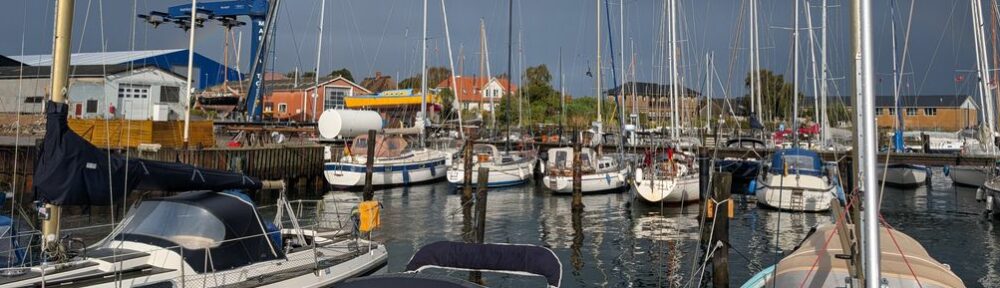 Gut 10 Minuten später sind wir bereits vor der Klappbrücke in Egernsund, wo wir auf der Ostseite an einem Pfahl festmachen. Wir lassen den Motor laufen. Um 09:15 öffnet die Brücke und wir binden los, um zu passieren. Wir haben Glück und finden eine freie Box, so dass der Bug Richtung Westen zeigt. Heute Nacht ist Wind mit Böen bis 9 Bft vorhergesagt. Außerdem soll der Wasserstand der Ostsee deutlich fallen. Wir binden die Heckleinen daher deutlich tiefer als gewöhnlich an den Heckpfählen fest. Außerdem bringen wir zusätzlich Ruckdämpferleinen und eine Achterspring an.
