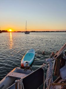 Die ist ein sehr ruhiger und geschützter Ort, der auch bei stärkerem Wind ausreichend Schutz bietet – das gefällt uns. Gegenüber der „Schleimarina Lindauhof“ gehen wir schließlich vor Anker. Natürlich gehen wir baden und Piet entdeckt das SUP für sich, mit dem er nach kurzer Zeit virtuose Manöver durchführt. Wir genießen den letzten Abend unseres Urlaubs bei angenehmen Temperaturen auf unserem Schiff, umgeben von wunderschöner Natur.