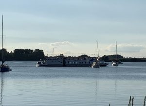 Nach einer erwartungsgemäß ruhigen Nacht, starten wir mit der Morgensonne Richtung Süden. Wegen Flaute mit „flüssig Wind“. Wir haben den Pinnenpiloten installiert und den Cockpittisch aufgebaut, den wir schließlich zum Frühstücken eindecken. Als wir Kalkgrund hinter uns haben, sehen wir von Achtern ein Boot der Küstenwache aufkommen. Für uns ist der Zeitpunkt gekommen, den Frühstückstisch abzuräumen und das unseemännische Verhalten zu beenden.
